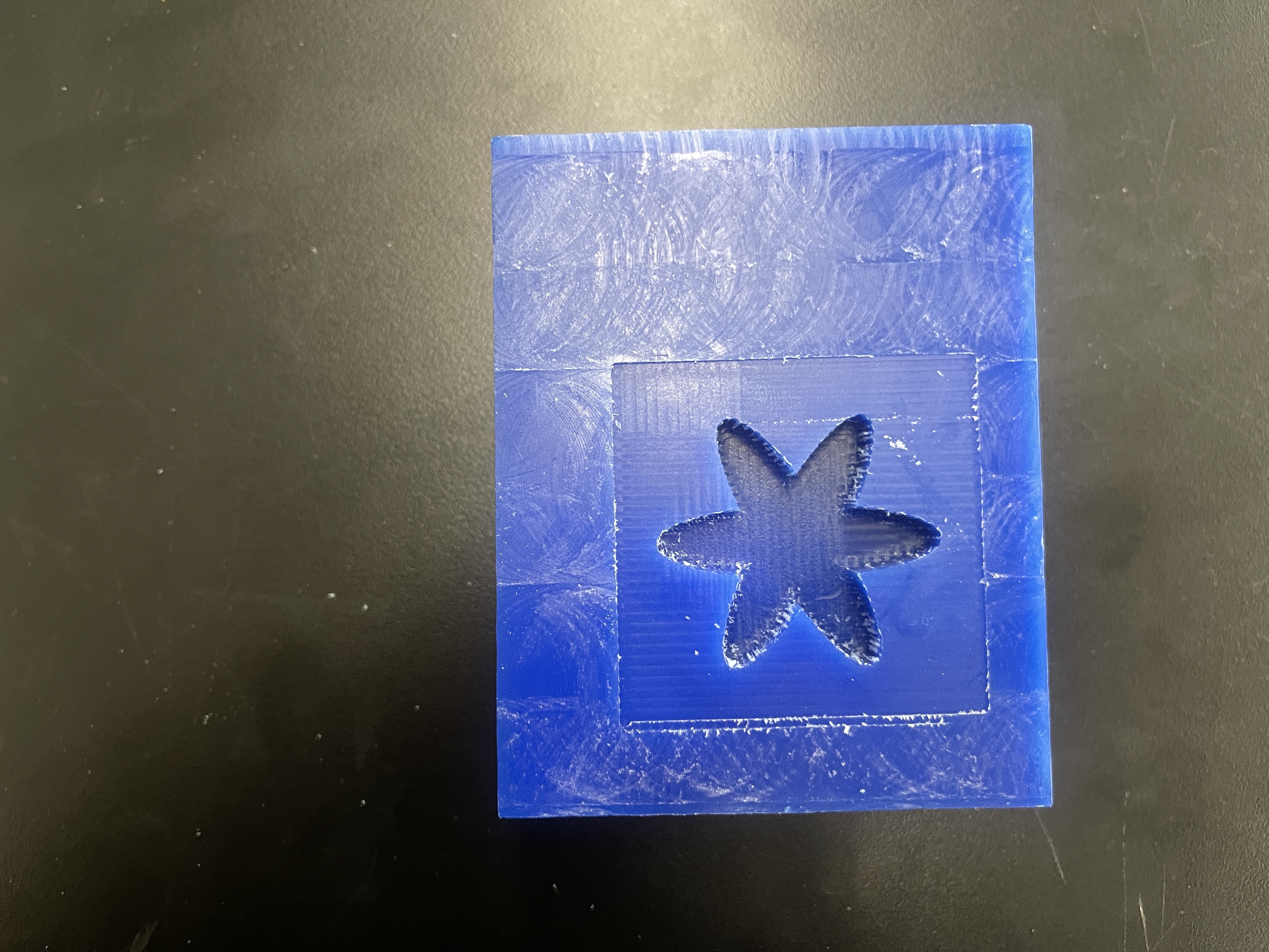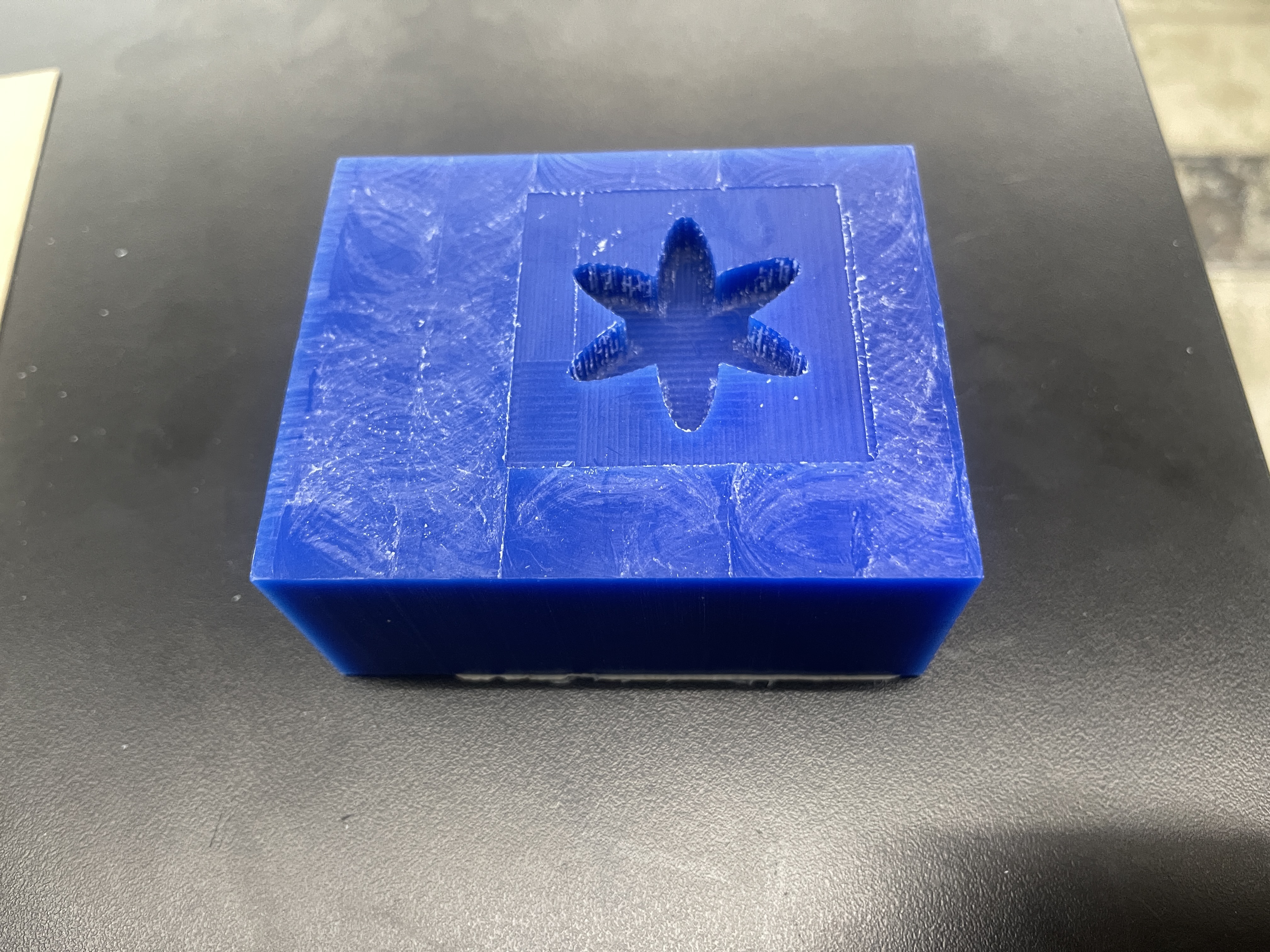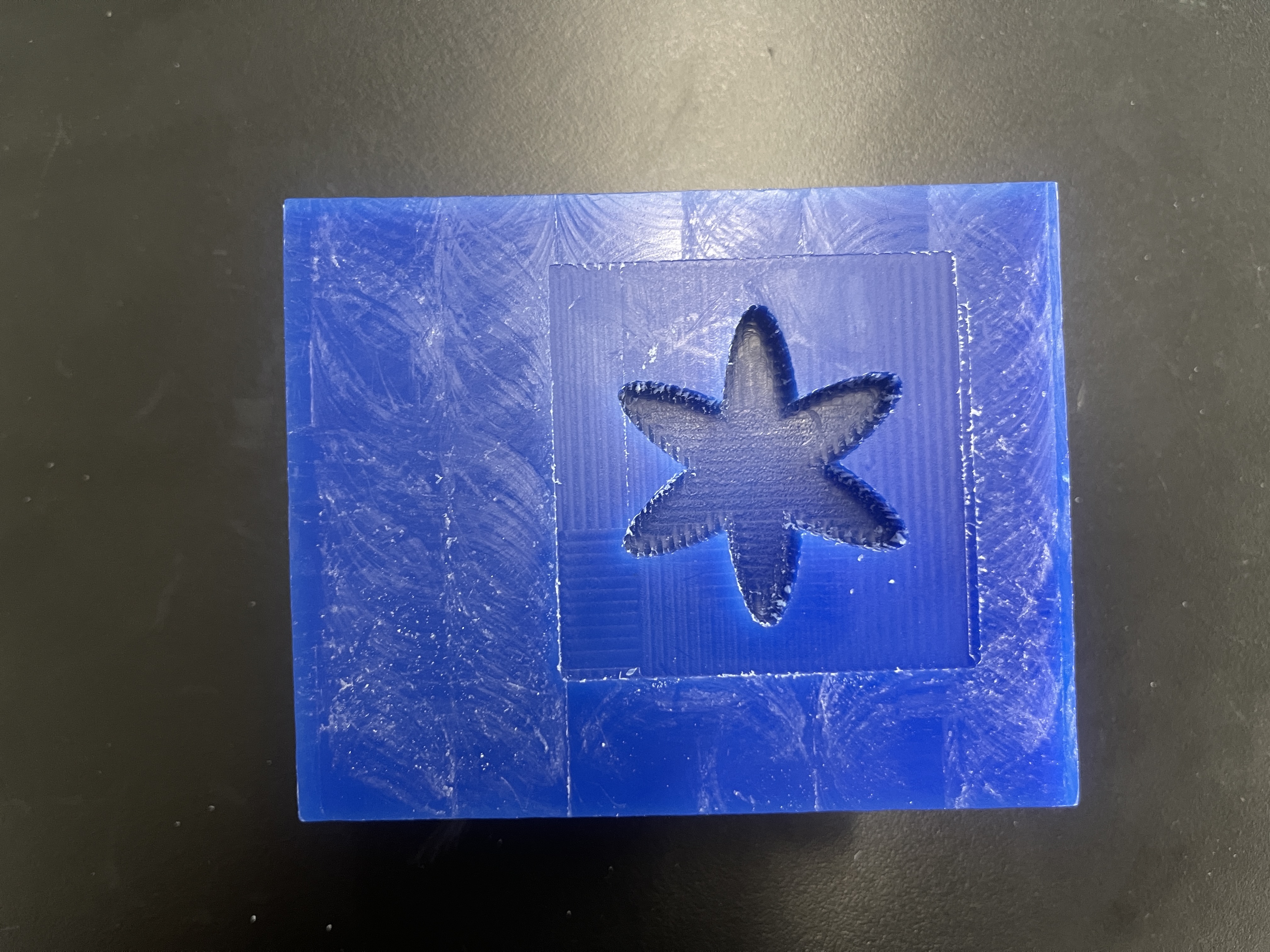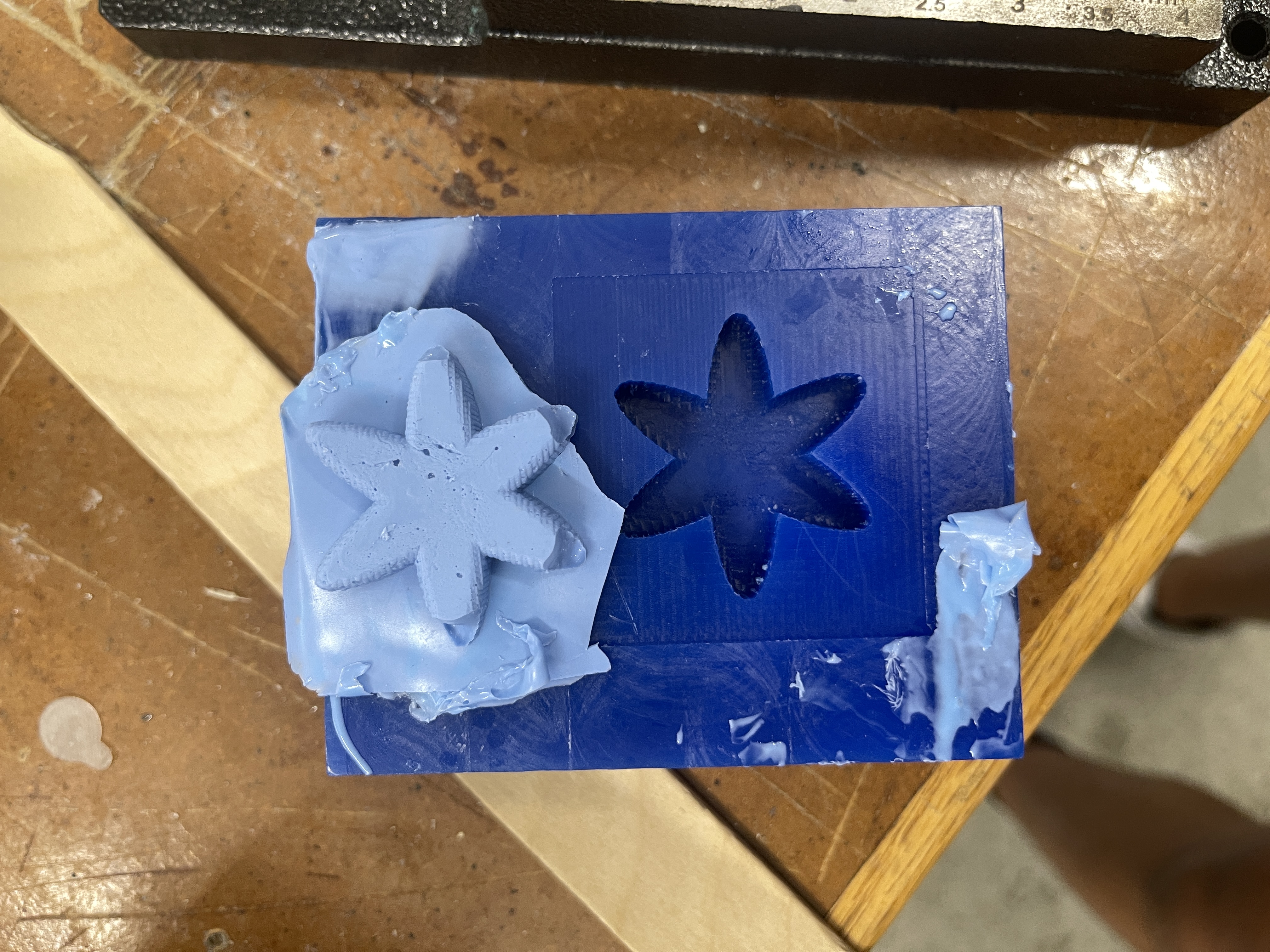 Once I successfully milled out the mold, I mixed the two casting solutions together, and used a popsicle stick to pour the final casting solution into the mold. After approximately 6 hours The waiting period was filled with anticipation, but finally, the fully cured cast was unveiled, showcasing the intricate details of the mold with a sense of pride and accomplishment. Throughout the casting process, ensuring that no air bubbles were trapped within the casting material proved to be a significant challenge. Despite my best efforts, the intricate design of the mold made it difficult to reach certain areas and dislodge any potential air pockets. To address this, I employed various techniques, such as gently tapping the mold and using a vibrating table to encourage the bubbles to rise and escape. Additionally, I carefully inspected the mold from different angles to detect any hidden air pockets that might have formed. It required a combination of patience and meticulous attention to detail to minimize the presence of air bubbles and achieve a flawless final result.