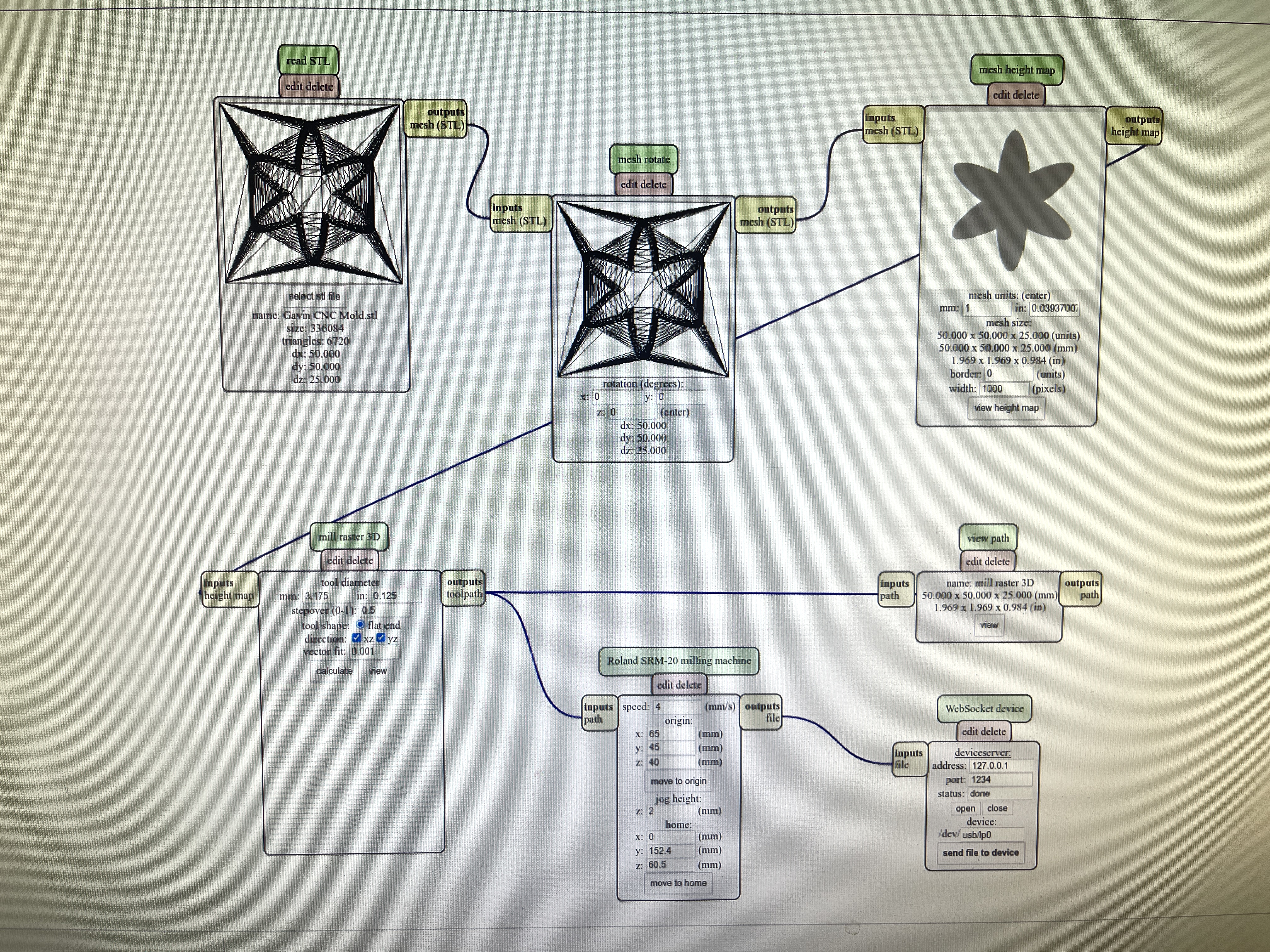 Once I created the STL file for the object, I needed to start milling the mold onto the wax block. So, I installed the STL file into a USB and used the monoFab SRM-20 milling machine to start the first step in the milling process: the roughing pass. Below are the setup configurations that I used for the roughing pass: