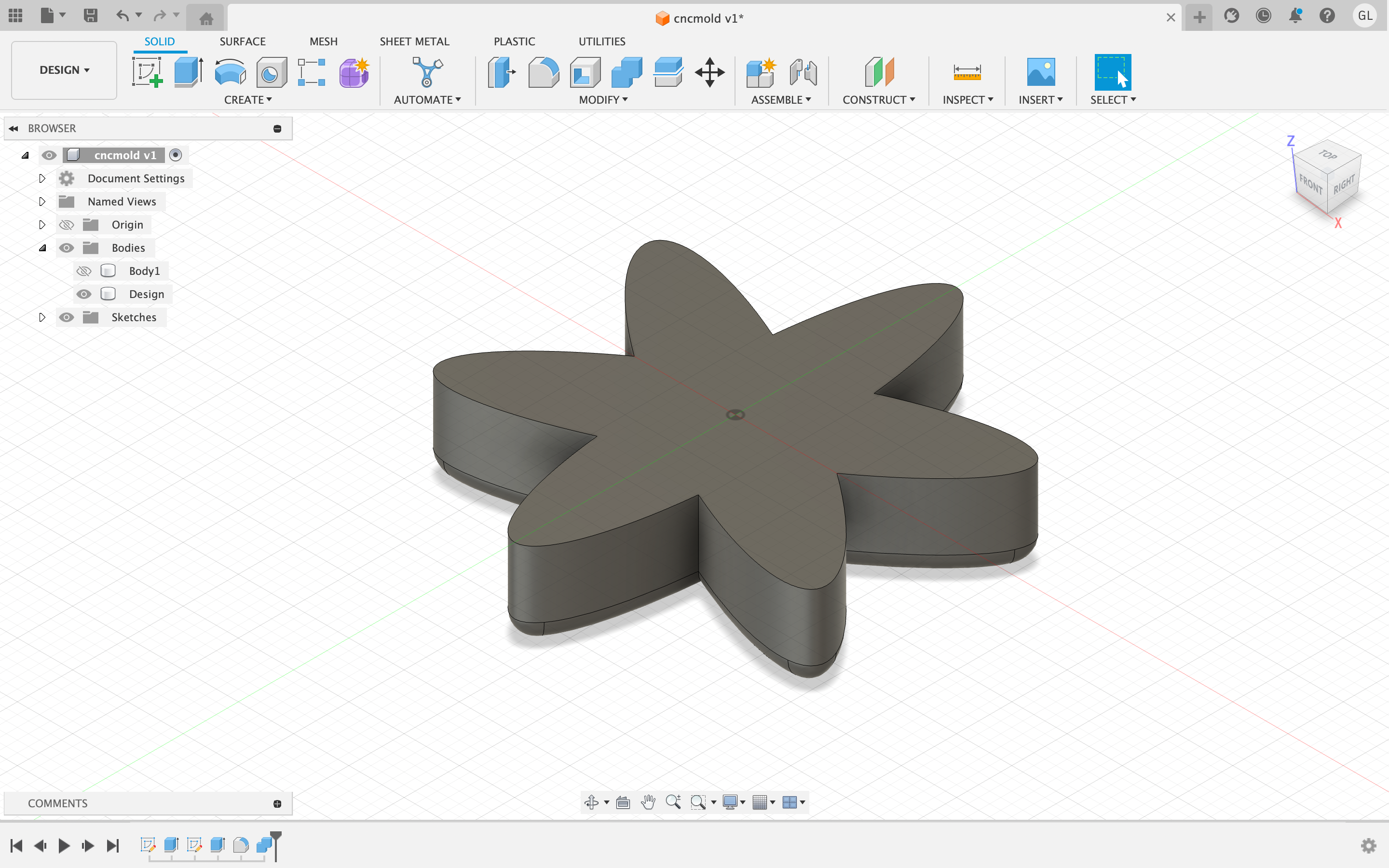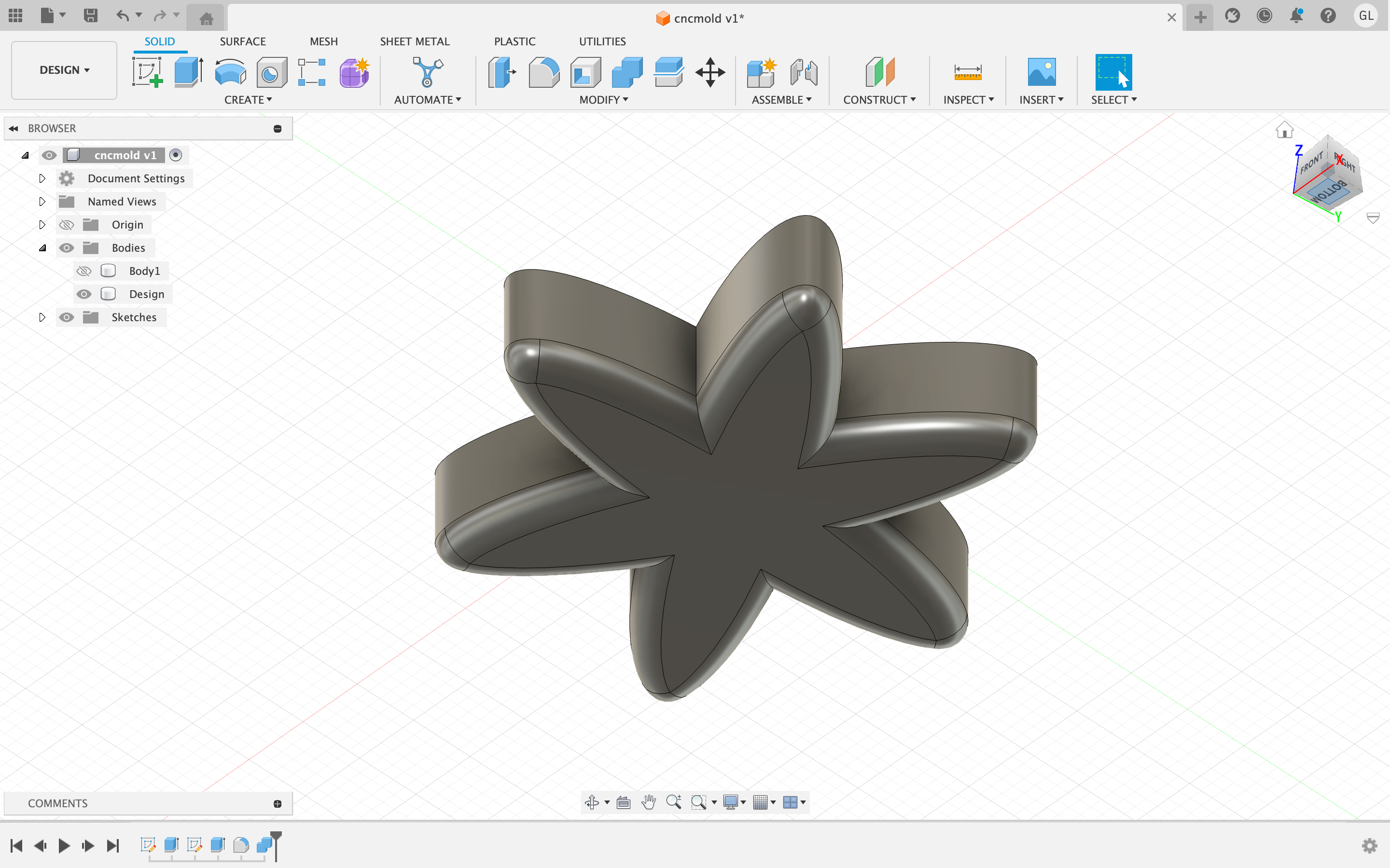 First, I created a body of a object; using the eclipse tool and the circular pattern tool, I created the 2D design of the object. After this, I extruded it to a certain degree, and then added filleted edges along the bottom side of the object.