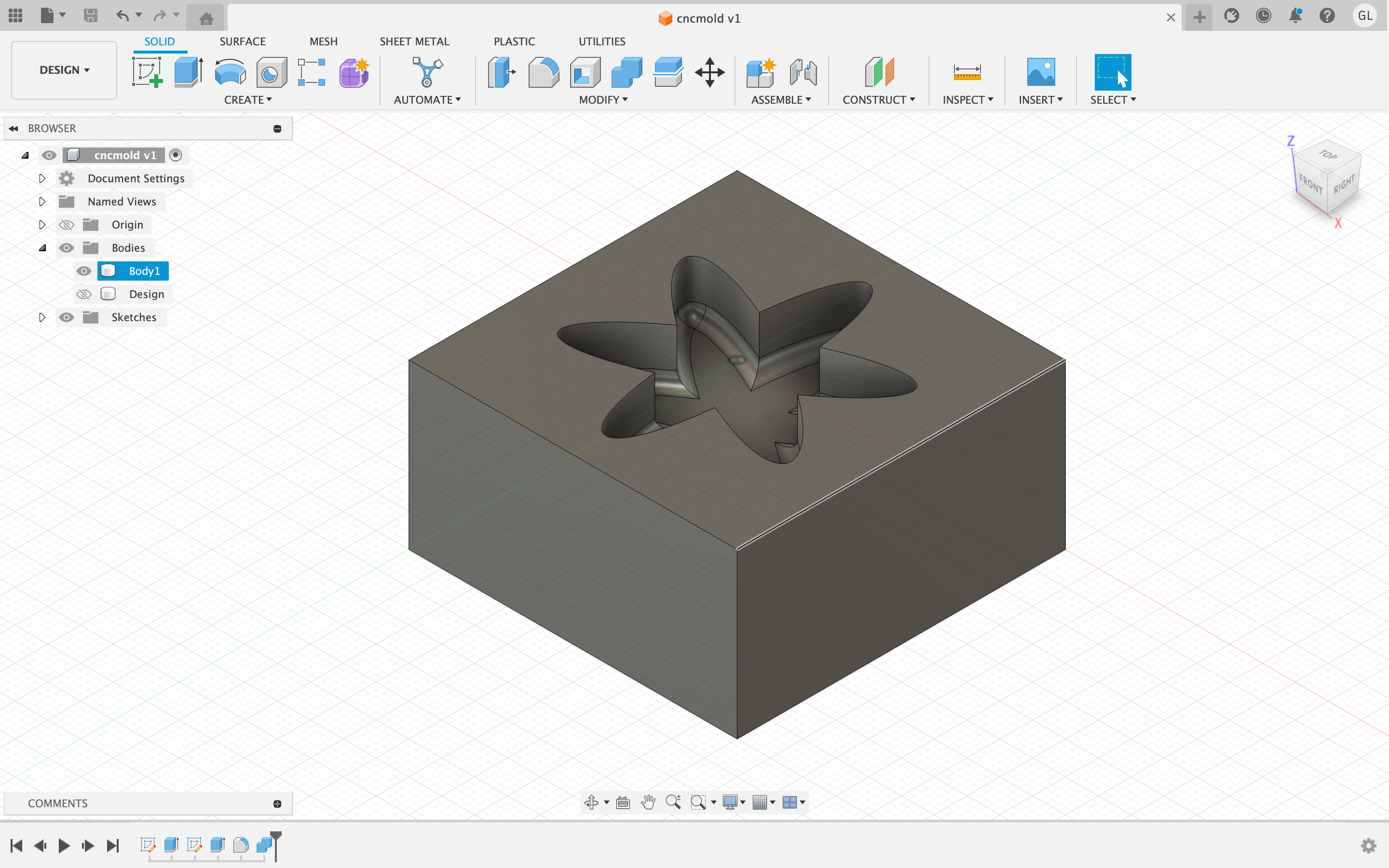 My plan was to create a mold for the molding/casting project using the monoFab SRM-20 milling machine. Using a wax block as my medium, I wanted to use the milling machine to create a mold for an interesting shape. So, first I used Fusion360 to create this shape, which would later be implemented onto the CNC mill.