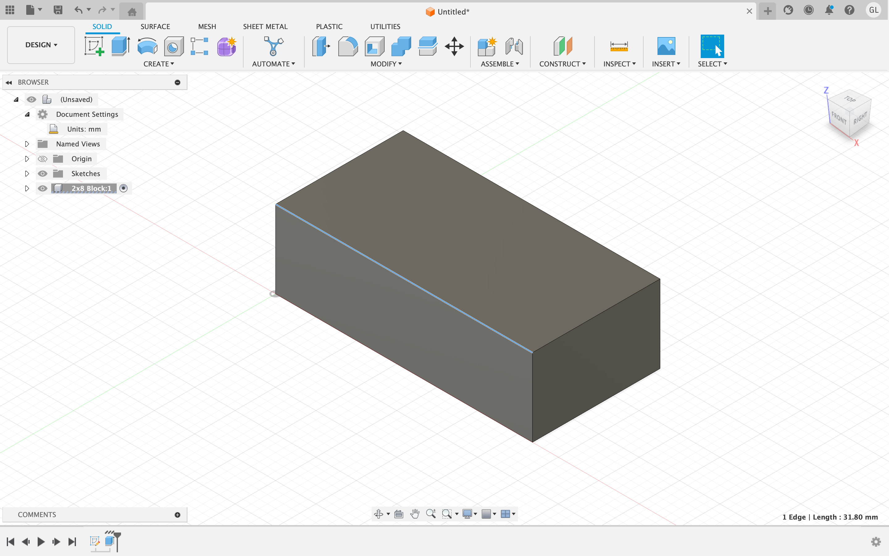 I tried to replicate the design of a Lego Block. I first started the design by creating a 2D rectangle and then extruding it to the dimensions of a lego block (0.6" x 2.5" x 0.5"). After creating the flat plane of the design, I then used the circle to create on of the circles on the top of the lego block.