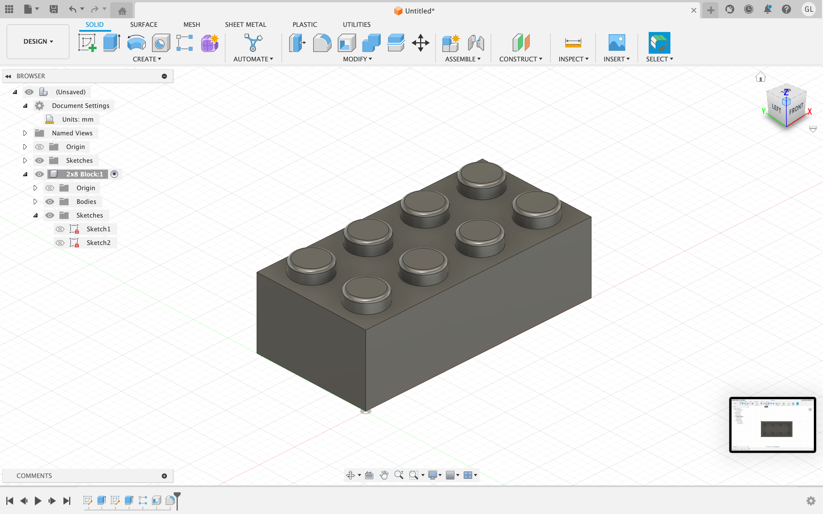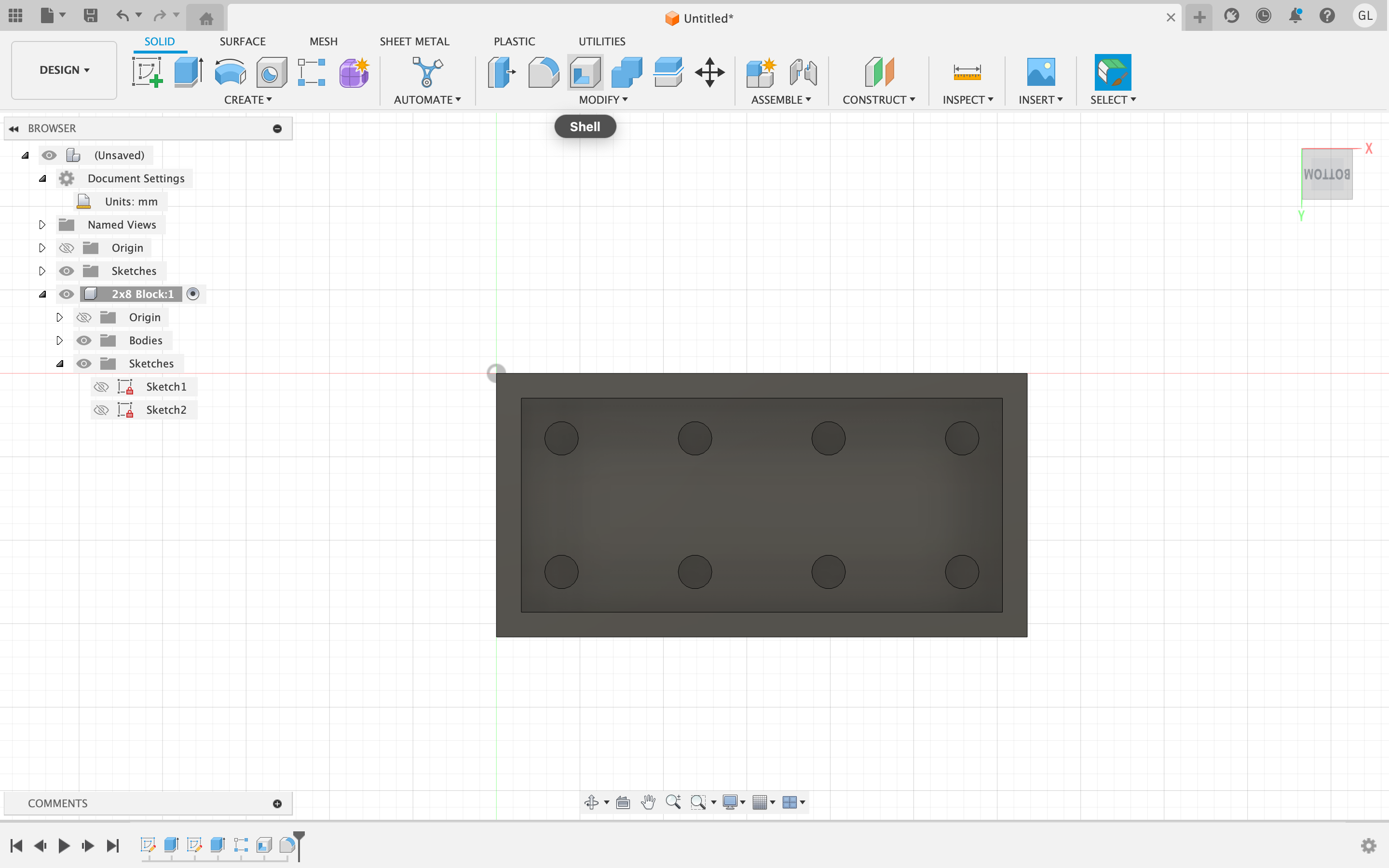 Using the rectangular pattern tool I added 7 more circles to the flat plane to create the 2x8 lego block. After this, I extruded the circles on the top so that they would stick out. Furthermore, I used the fillet tool on the brims of the circles to give it a more realistic look. In addition, I then used the hollow tool to make the inside of the lego block hollow.