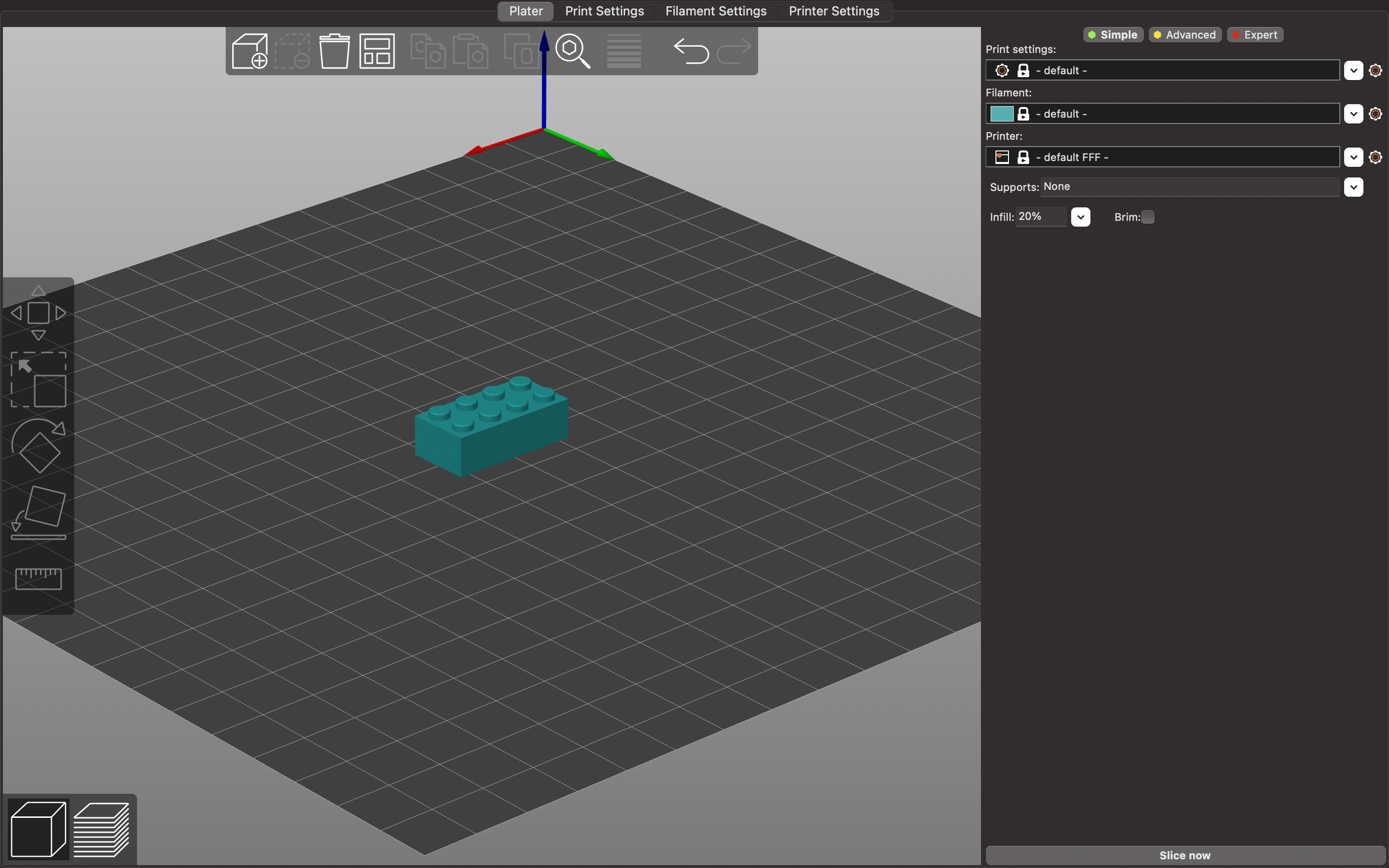 After fully designing the 3D model of the lego block, I saved the Fusion360 file as a mesh, and then implemented the model on towards PrusaSlicer. Before slicing the 3D model of the lego block, I created a support structure in the base of model. The reason for this was because the model was hollow in the middle; without the use of support structures, the 3D print would have malfunctioned due to a lack of solid structure.