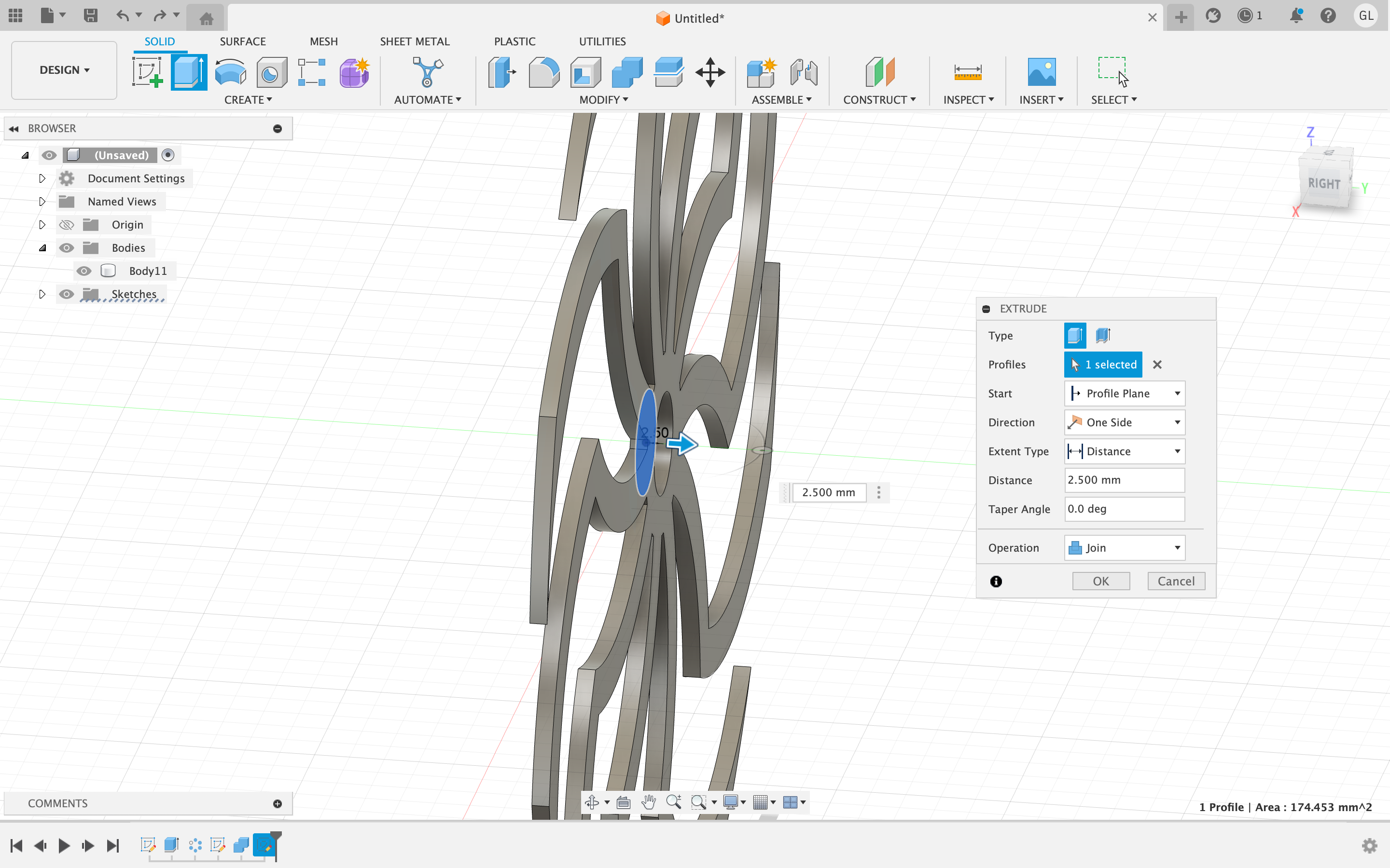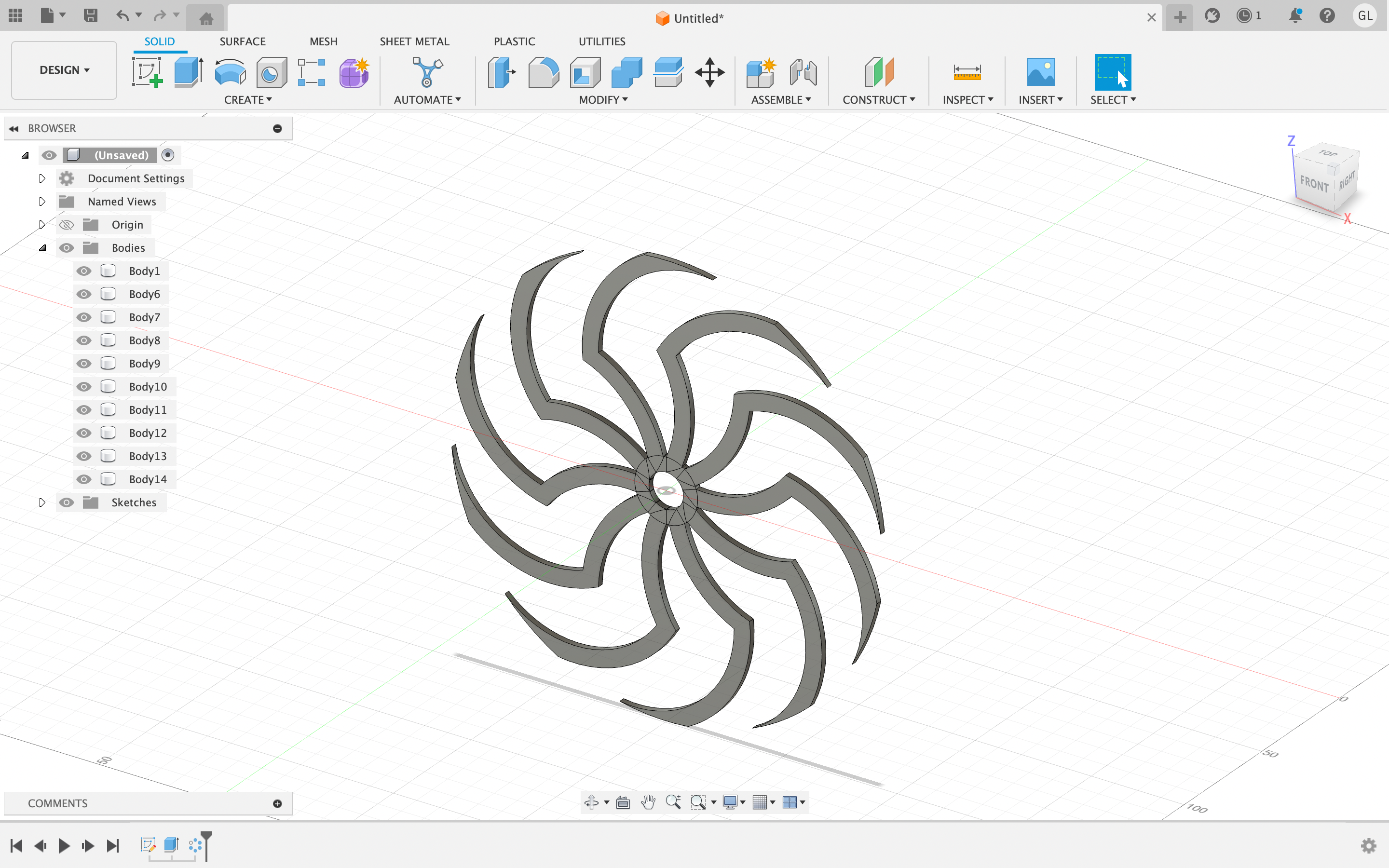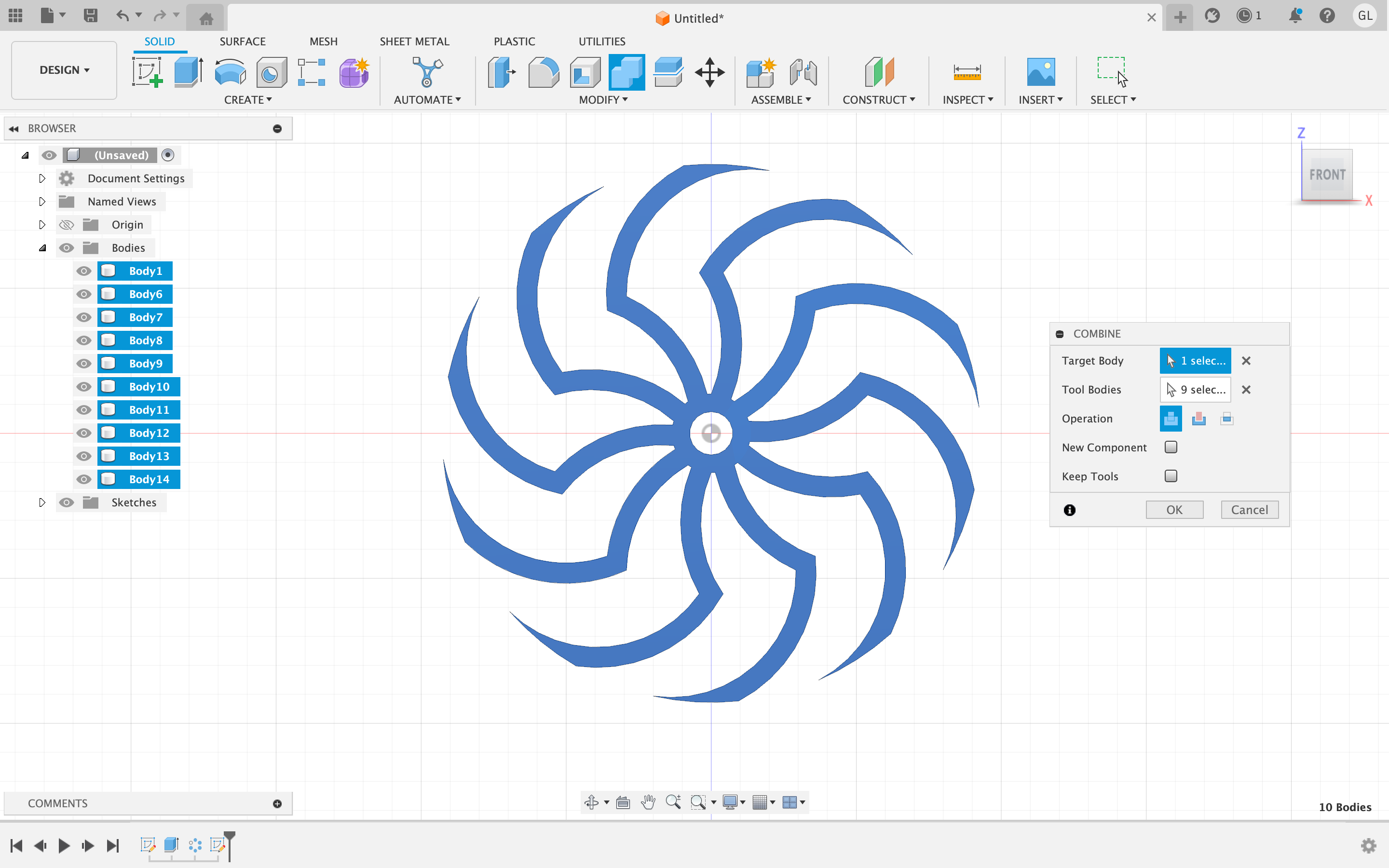 To create the shape, I started by designing a 2D hand shape. Using Fusion 360, I utilized the circular pattern tool to replicate the hand shape around the center, creating a total of 10 hands. After completing the duplication process, I employed the combine tool to merge all of these individual hand shapes into a single cohesive shape.
