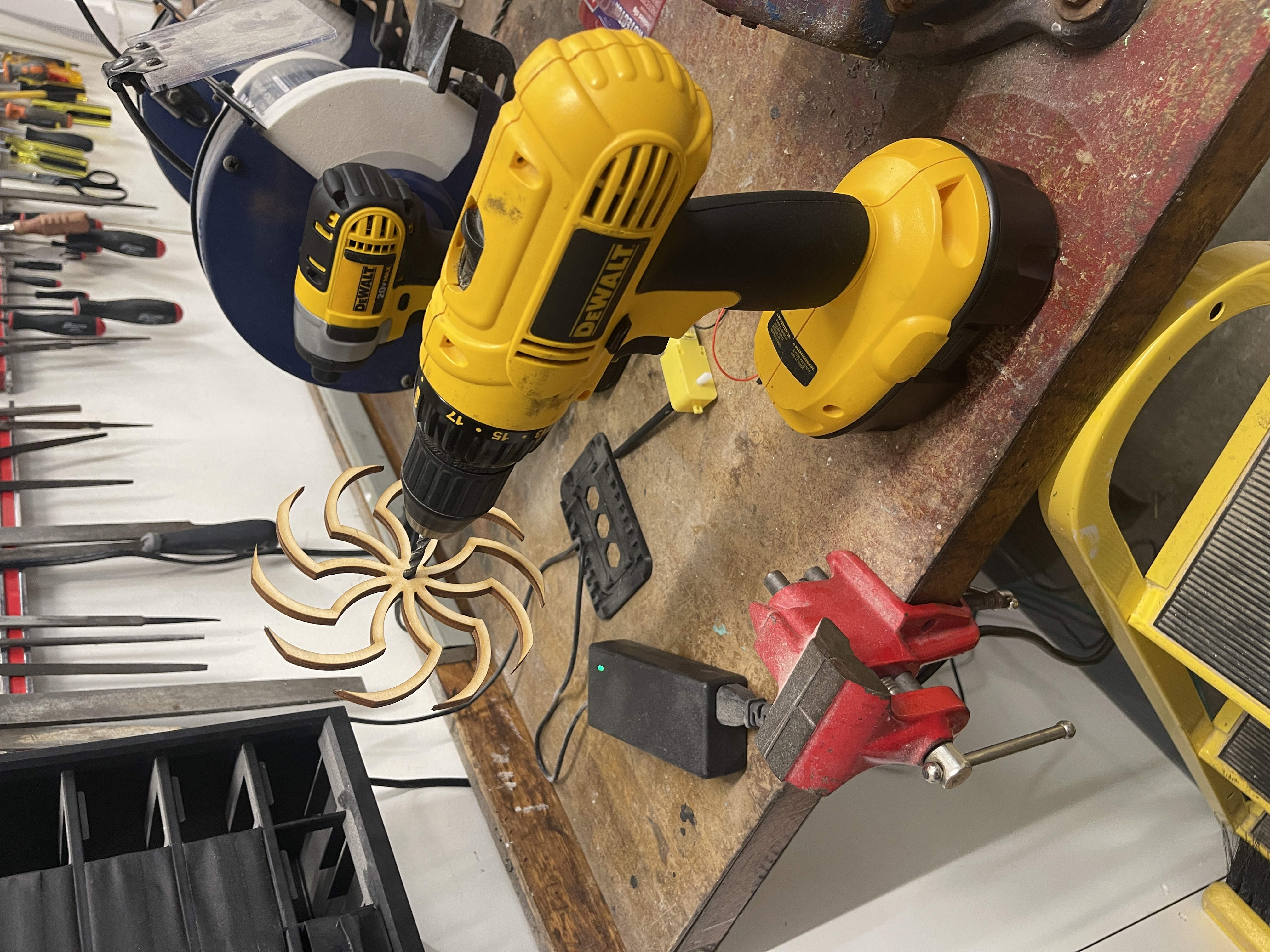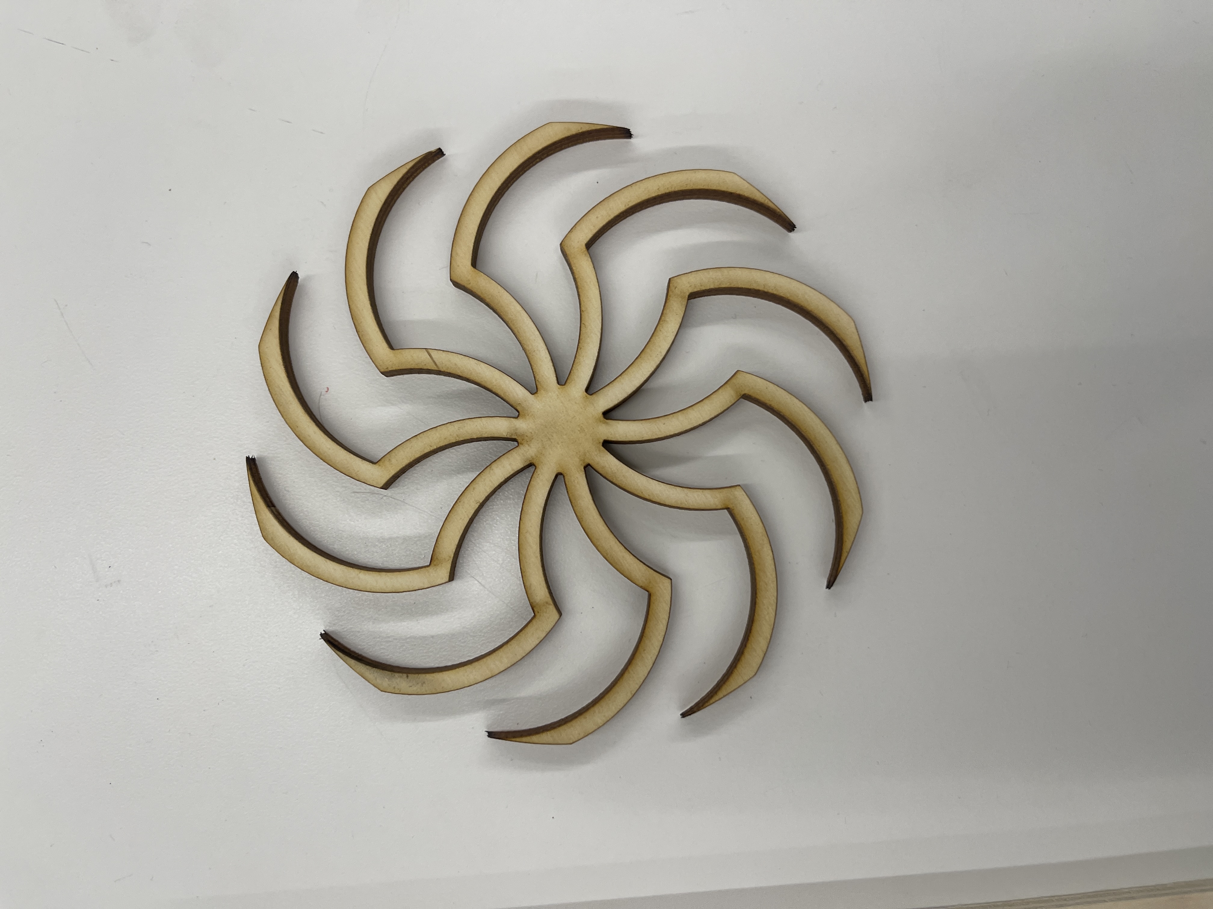 After designing the 2D model of the shape, I implemented this onto the laser cutter using a medium of plywood. I also then used a hand drill to create a small hole (with the same size as the wooden rod) in the center of the shape.