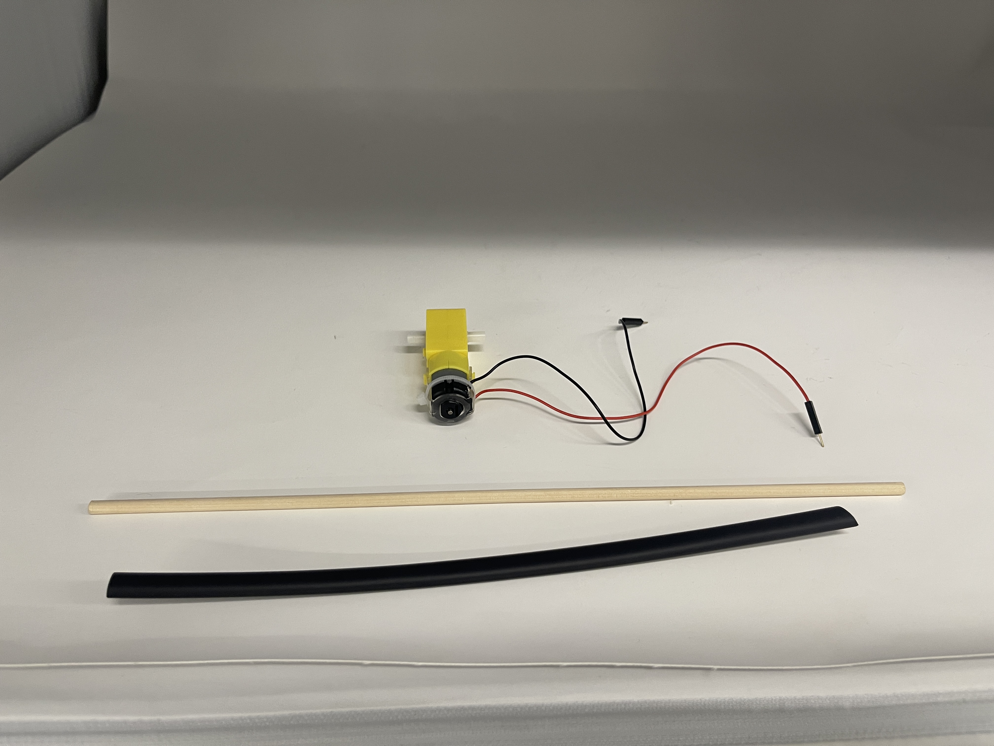 Furthermore, I also attached a wooden rod to the end of one of the axles on the motor. This was because the motor's original axle was too short to fully fit through the hole of the shape that I designed. Using a heat shrink tube, I connected a wooden rod to the end of one of the motors.