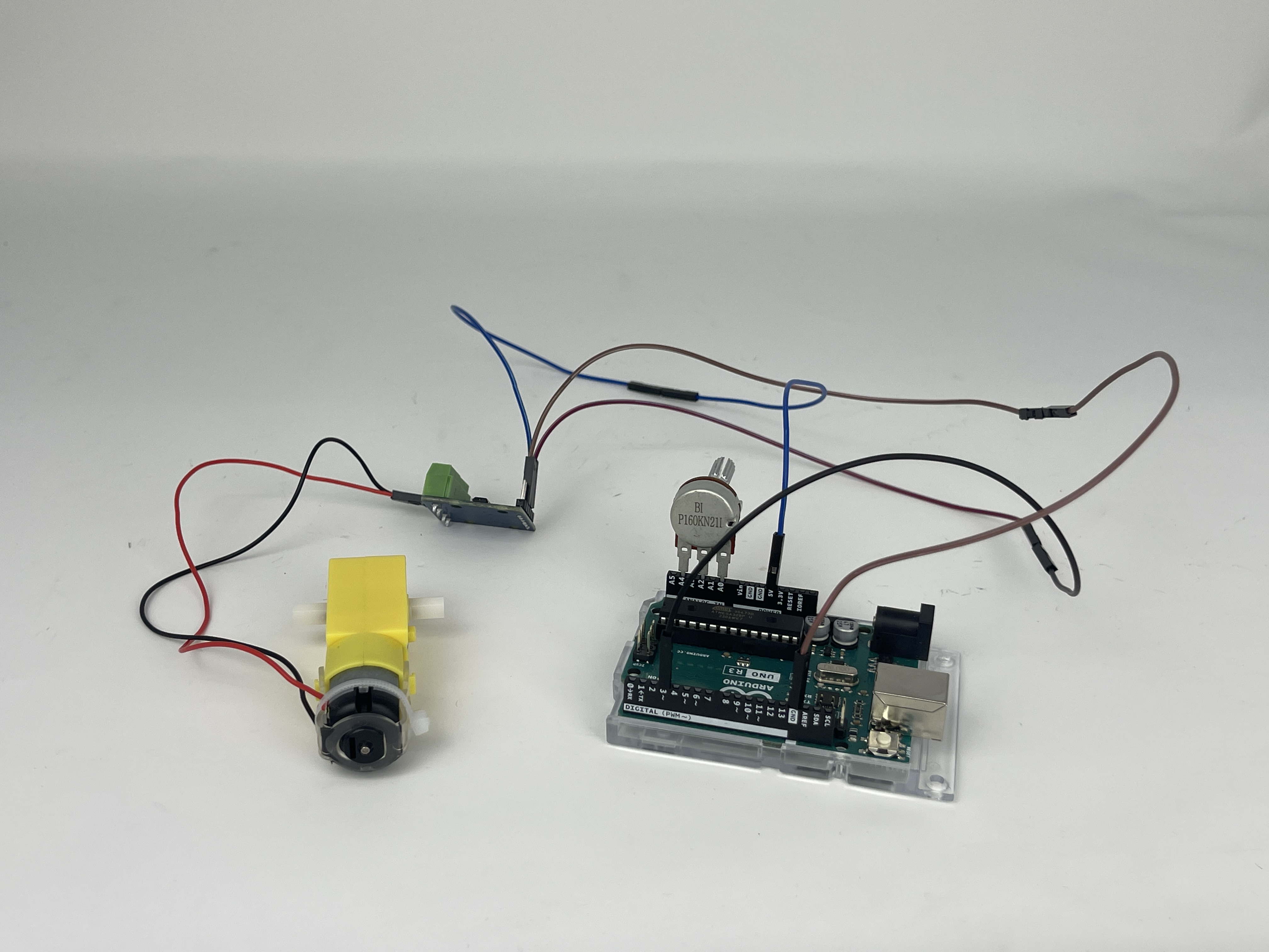 The next step was to create a running motor which would have an axle that would go through the hole of the shape. Using an arduino (micro-controller), I programmed a sequence which would use a potentiometer to control the speed of a specific motor. Above is a picture of my setup and below the Arduino code I used to control the potentiometer and the motor.