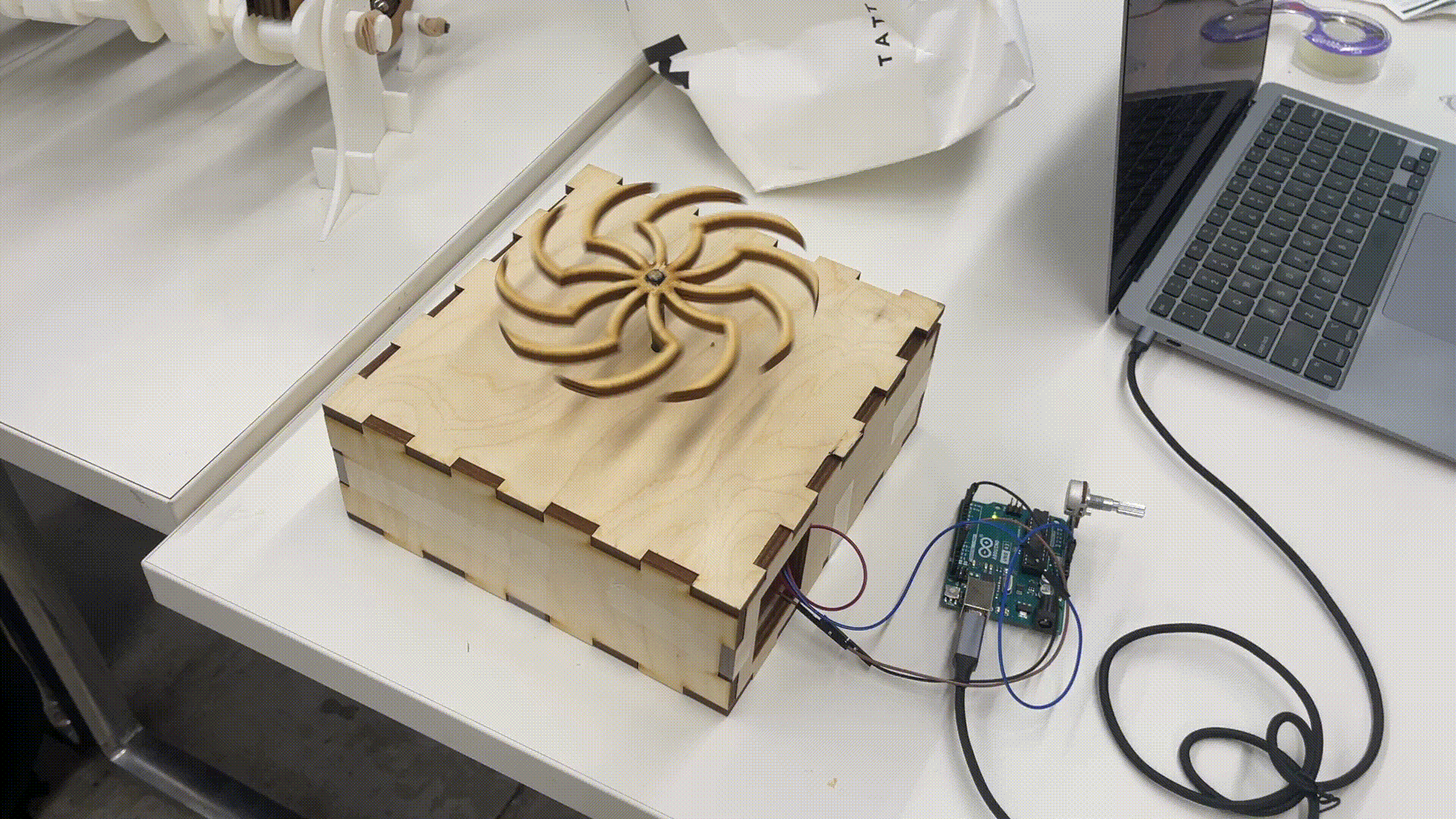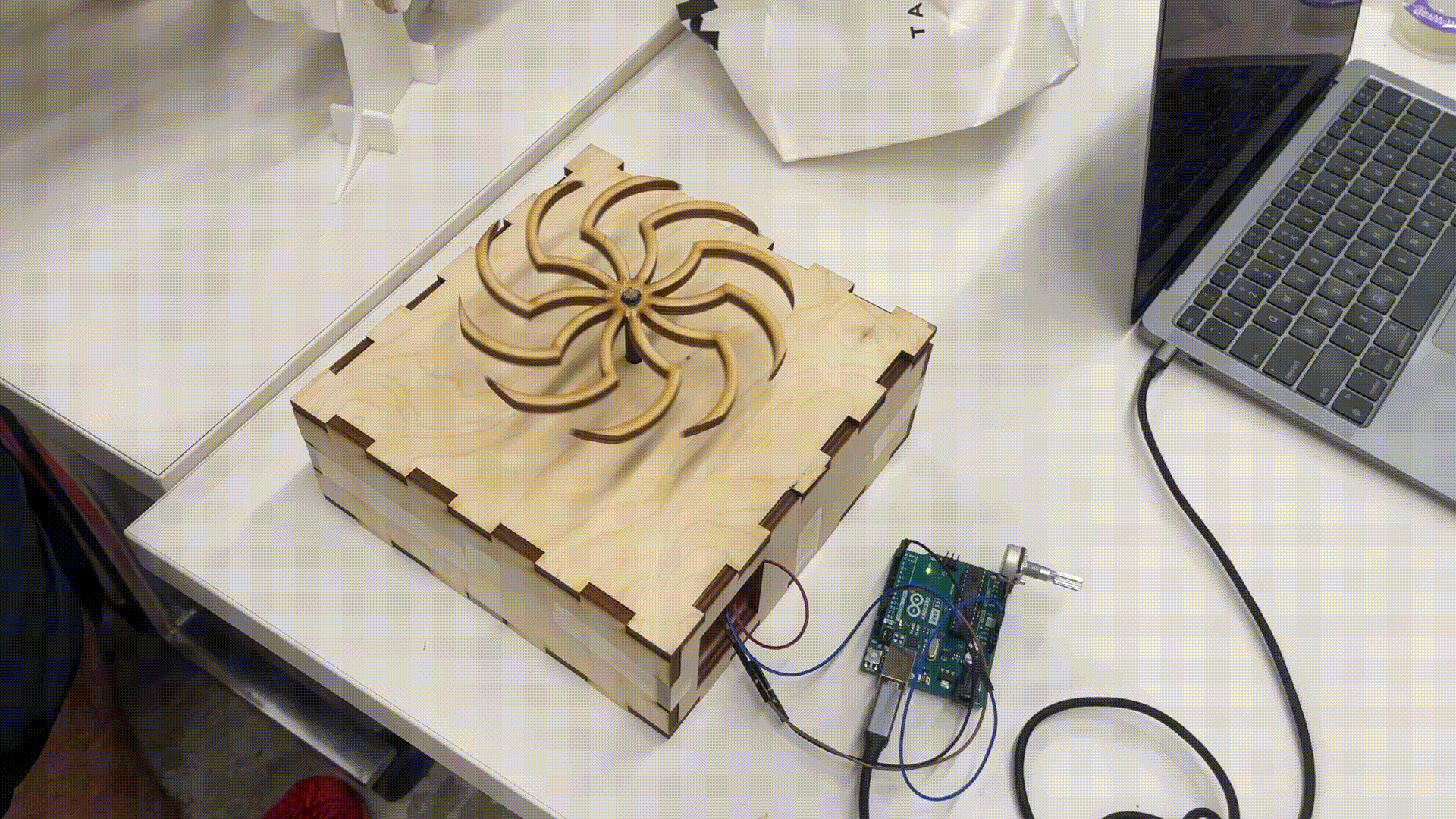 I believe that this assignment turned out pretty successfully. I managed to create the kinetic scultpure and implement the use of the Arduino and micro-controller programming, to control the speed of the motor. However, one limitation of this product would have been the structure that I created to hold the spinning shape in place. I could have created a compartment that held all of the components of the kinetic scultpure, but also hides the Arduino and the wires. Furthermore, I had some problems trying to get a second stationary shape in the sculpture, in order to fully replicate the model that I used as inspiration for this.