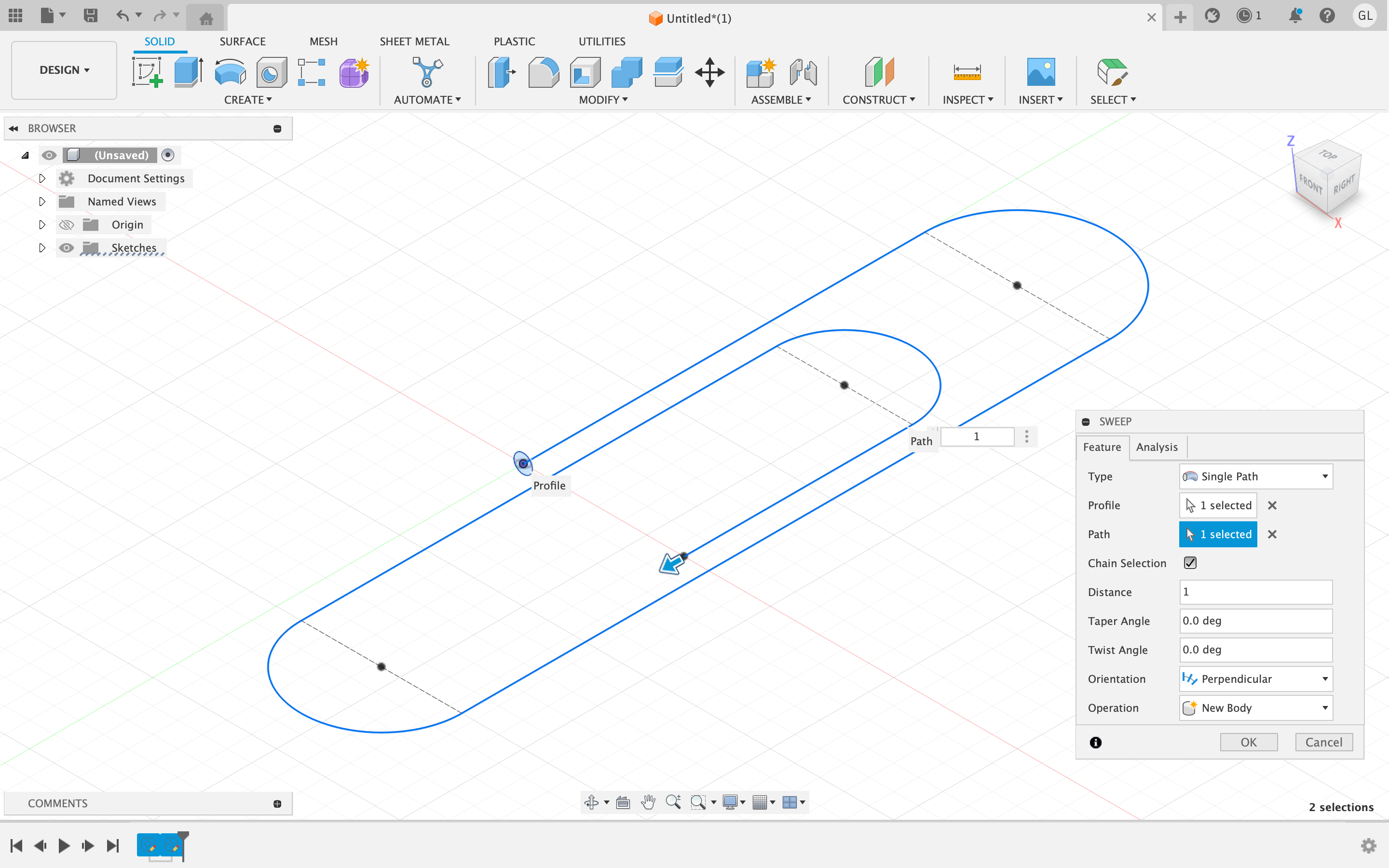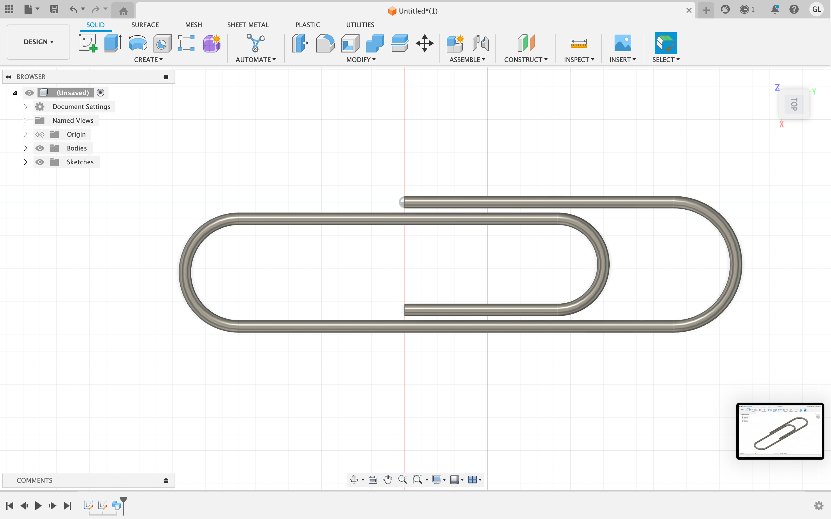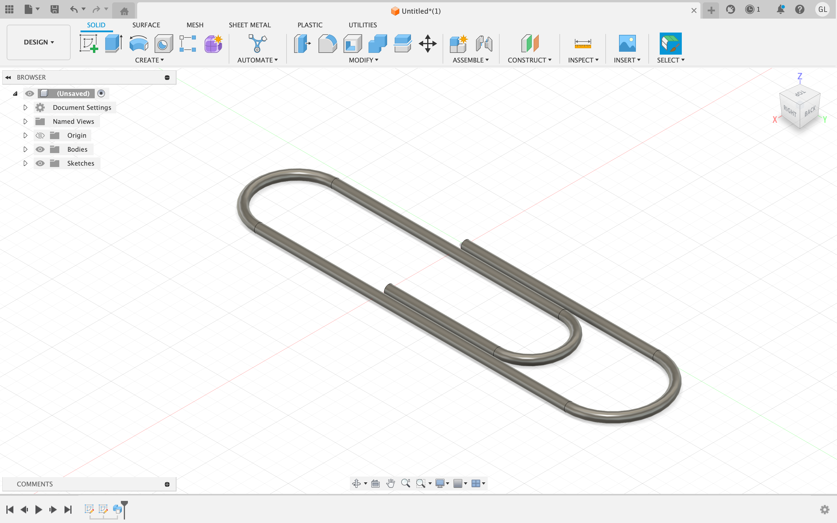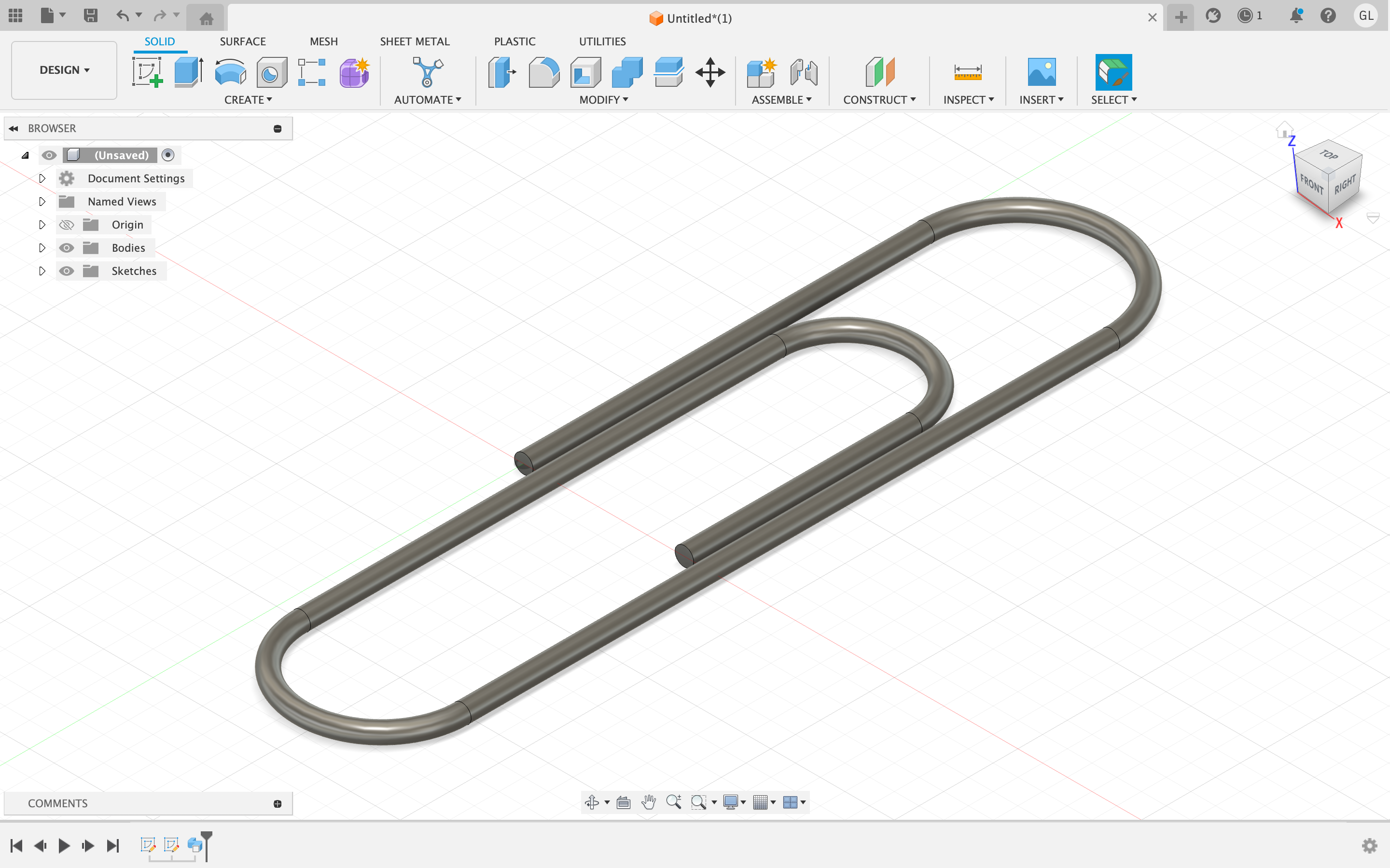 Similar to the pencil design, I initally sketched out a 2D design of the paperclip (on the x-plane). I used straight lines, along with the tangent arc tool to generate the curved sides of the paperclip. After creating this 2D sketch, I created another sketch on the y-plane within Fusion360. I utilized this second sketch to create the thickness of the paperclip. In addition, I used the sweep tool, to extrude the sketch of the thickness of the paperclip throughout the inital 2D line of the paprerclip. was able to create a replica of a paperclip. After completing this design, I wanted to add a metal finish to the paperclip, so I used the apperance tool and applied a dark metal finish to the design.